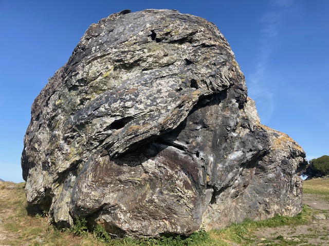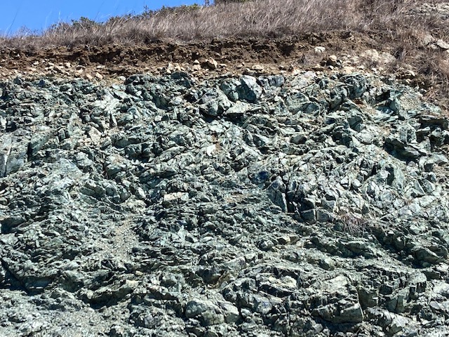 California’s state rock, the metamorphic Serpentinite, forms when ultramafic Peridotite from within the earth’s mantle, gets squeezed up through the oceanic crust and comes in contact with sea water, which changes its chemistry and composition. Blueschist is a rare example of high grade metamorphism, which only occurs under high pressure and high heat deep in a subduction trench. Outcrops of Blueschist are beautiful and rare. Highly studied outcrops are found atop Ring Mountain Preserve on the Tiburon Peninsula.
