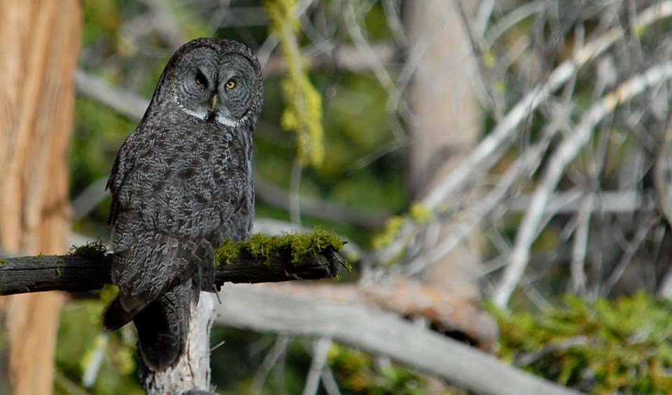 Highly specialized for snow pack hunting, the Great Gray owl has evolved the largest “facial disc” of any owl, which aids in detection of low frequency sounds from beneath the snow. They have also evolved wings with the most specialized adaptations for silent flight of any bird, in order to facilitate silent hovering directly above prey, which allows for the least attenuation and refraction while listening with those large facial discs!