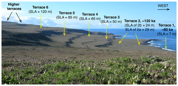 Steady tectonic uplift of the emergent active coastal margin, combined with the erosional forces of wave dynamics, produces a series, or flight, of stair-stepped geomorphic plateaus, known as marine terraces. Through dating methods such as uranium series dating and acid geochronology of bio- mineralogical materials, as well as cosmogenic radionuclide inventories, marine terraces have been aged to closely correlate with earth’s marine isotopic stages, and global sea level regressions and transgressions.