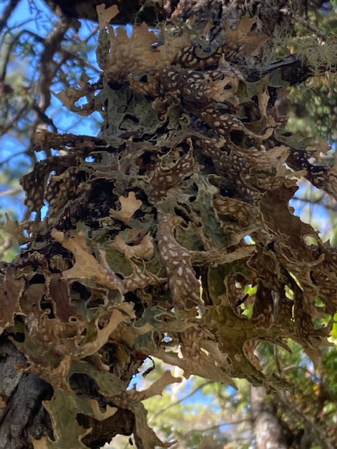 Underside hosts pockets of cyanobacteria/blue-green algae, nitrogen-fixing bacteria. Thus, L. pulminaria is a cyanolichen, contributing nitrogen to the forest ecosystem upon decomposition, R. Forest