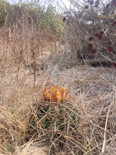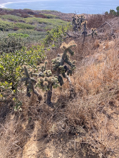 The species composition of Maritime Succulent Scrub includes shrubs typical of southern Coastal Sage Scrublands, such as Coastal sage (Artemisia californica); Lemonadeberry (Rhus integrifolia); Deerweed (Lotus scoparius); California buckwheat (Eriogonum fasciculatum); and salvias. This unique botanical assemblage also features succulent species. These include, Ferocactus viridescens; Cylindropuntia californica and C. prolifera; Hesperoyucca whiplei; Yucca schidigera; Opuntia littoralis; Agave shawii; Bergerocactus emoryi; as well as numerous dudleya species.