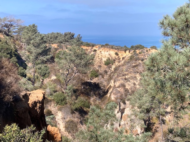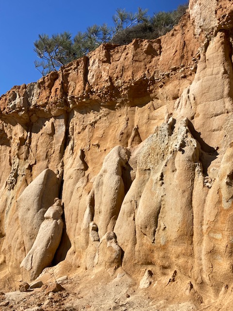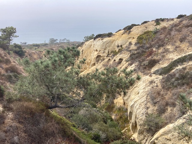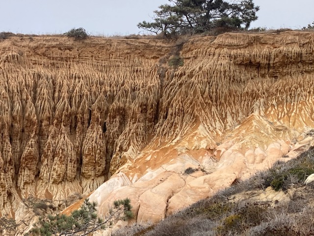 Torrey Pines SNR is also famous for its towering and plunging color-blocked exposures of blush toned sandstone and mudstone sedimentary facies. Built on a tectonic foundation of uplifted marine terraces, signature landforms of the Reserve include badlands, rill networks, ravines, sea cliffs, concretions, tafoni, faults, fossil beds, and mesas (see topic A15 on link).