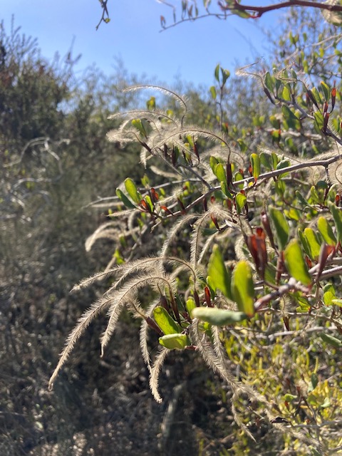 Dominant and signature woody shrub types of the Maritime Chapparal at Torrey Pines, includes Nuttal’s scrub oak (rare – Quercus dumosa), White coast ceanothus (rare – Ceanothus verrucosus), Chamise (Adenostoma fasciculatum); Manzanita (Arctostaphylos spp.); Toyon (Heteromeles arbutifolia); and Smooth mountain mahogany (Cercocarpus minutifolus).
