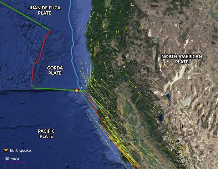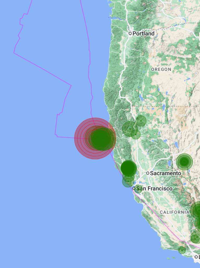 On December 5th, 2024 the most seismically active region in California had its largest earthquake in 20 years*: a magnitude 7.0 along the Mendocino Fracture Zone, approximately 35 miles offshore of Cape Mendocino, at a depth of 10 km/6.2 mi beneath the ocean floor. Fault rupture and tectonic release occurred as a result of right lateral strike slip motion conveyed by the eastward movement of the subducting Gorda Plate relative to the north-westward motion of the Pacific Plate.