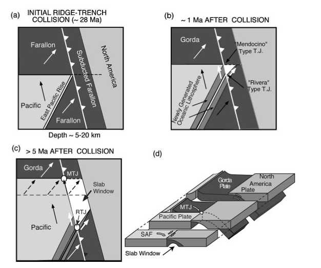As the Pacific Plate and the Triple Junction overtake the subducting Gorda Plate, the edge of the lithospheric slab of the subducted plate is severed and absorbs within the mantle. This forms a gap, or slab window, beneath the thinned lithosphere of the northeastern corner of the Pacific plate, and is occupied by upwelled asthenospheric material.