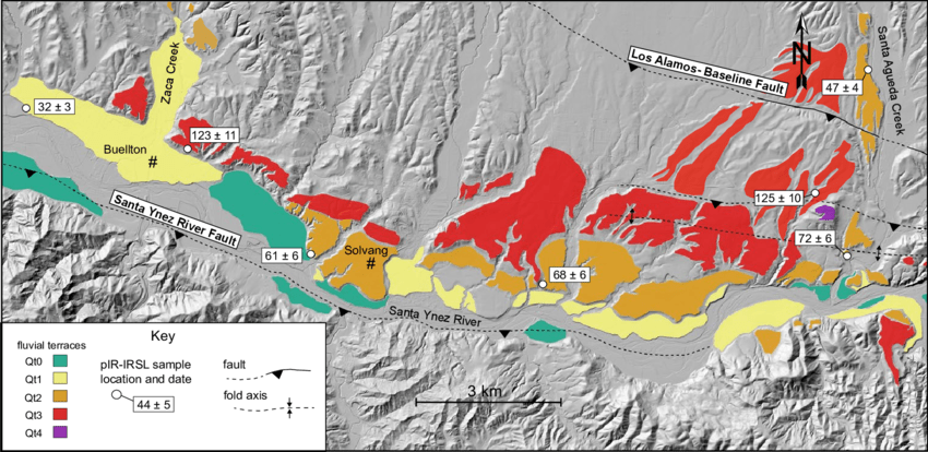 The geomorphic expression of the active tectonics of the Santa Ynez River Valley and its associated faults is seen in a series of uplifted fluvial strath terraces that follow the length of the valley where the river encounters the fault. By mapping, measuring, and dating the terrace profiles along the fault, researchers have been able to infer the prehistoric time frames of episodic tectonic uplift in the region, as well as what local and deeper/regional mechanisms drive contractional uplift and topographic development of the surrounding mountains and structures.