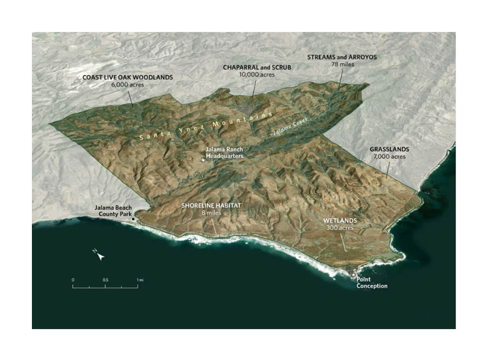Acquired in 2017 by the Nature Conservancy with a private donation for the purchase, the Dangermond Preserve includes oak woodlands, maritime chaparral, coastal sage scrub, riparian areas, rare seasonal marine terrace wetlands, Bishop pine and Monterey cypress stands, dune system habitats, and coastal prairie ecosystems within the western most tip of the Transverse Ranges. The coastal reaches of the Dangermond Preserve are contiguous with the Point Conception Marine Reserve, extending the conserved areas, zones of ecosystem connectivity, and invaluable wildlife corridors even further.