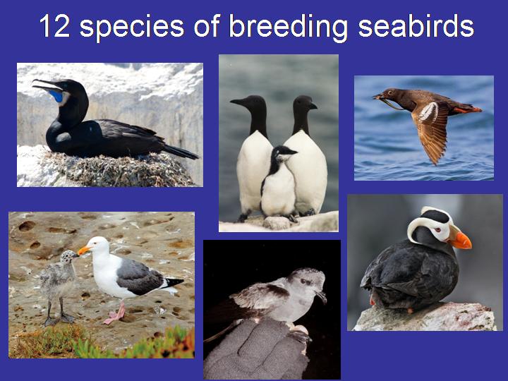 The Farallon Islands host the largest seabird rookery on the west coast of North America, with 12 species of breeding seabirds: Ashy Storm-Petrel, Black Oyster-catcher, Brandt’s Cormorant, Cassin’s Auklet, Common Murre, Double-crested Cormorant, Leach’s Storm-Petrel, Pelagic Cormorant, Pigeon Guillemot, Rhinoceros Auklet, Tufted Puffin, and Western Gull