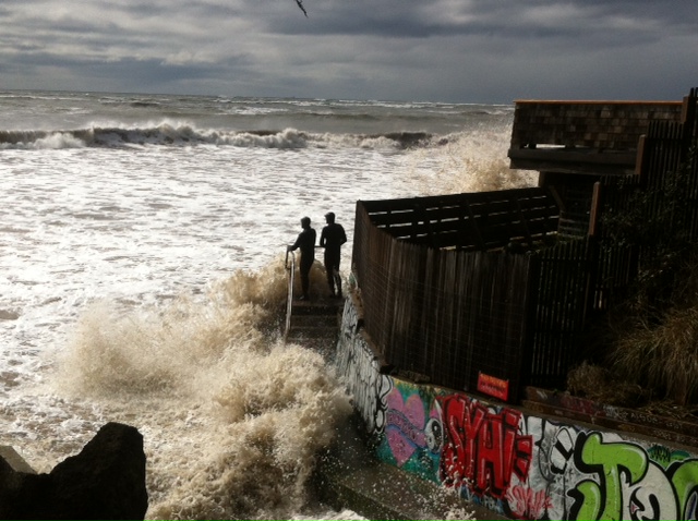 So – it was up early for me, check-in with Hawaii, then hit the road for semi high ground at the Marin coast. The sea change was subtle at first, but by 9:00 a.m., March 11, 2011 had become the eeriest day of my life. In an instant the good-sized surf fell quiet and calm, and the ocean’s retreat revealed so much rock and sea floor further and further out that it sent shivers up my spine, and exclamations from the onlookers around me. The ncoming surge and swells that followed soon churned and rumbled-in, flooding Stinson Beach, Bolinas Beach and the Bolinas Lagoon completely. This pattern continued for every half hour until I left the scene at noon.