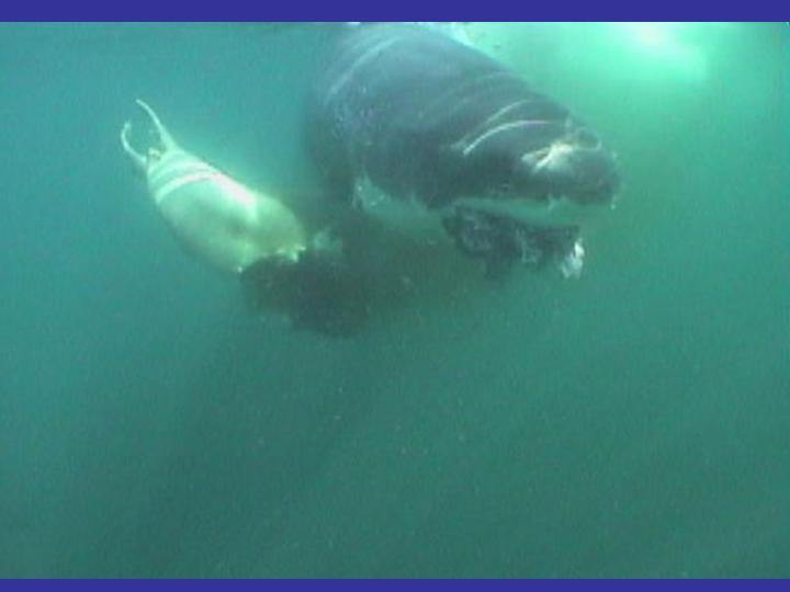 Other curious and significant findings include the pattern of individual sharks feeding at the same locations on similar dates on successive years (Anderson et al, 1996), leading scientists to surmise that sharks regulate the timing of their extensive, Pacific-wide movements far more precisely than previously perceived. Also discovered through long term monitoring, are temporal sex-specific occurrence patterns among adult white sharks at Southeast Farallon Island, with adult males occurring every year, and females occurring every other year at most. “This sex specific occurrence pattern implies a 2-year reproductive cycle, resulting in a lower reproductive potential than previously thought, which has important implications for the conservation of this species. These results also suggest that female white sharks may travel significant distances in the North Pacific Ocean during a biennial reproductive cycle to give birth, whereas copulation may occur closer to northern CA, allowing males to return annually to SEFI,” (Pyle et al 2003).