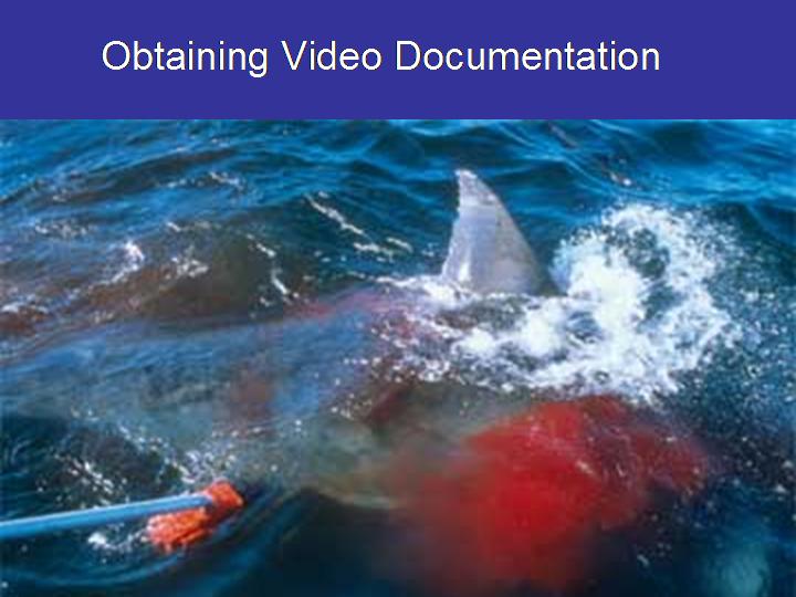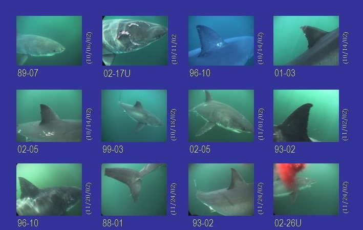Predation by White Sharks on pinnipeds had been observed by Farallon biologists on island since the early 1970’s, and a methodological White Shark monitoring project was launched in 1987. “From 1987-2000 during daily observation in autumn (1 September to 30 November), we identified and documented individual white sharks using size and unique markings such as scars, mutilated fins, natural pigmentation patterns, and the distribution of notches on the trailing edge of the dorsal fin. From 1987-1992 sharks were documented with still photographs and shore-based video recorders. By 1993 we discovered that white sharks investigated small vessels or decoys particularly during and up to two hours subsequent to feeding events on pinnipeds. This behavior allowed us to employ underwater video recorders mounted on poles to document individual sharks and confim sex,” (Pyle et al, 2003) .