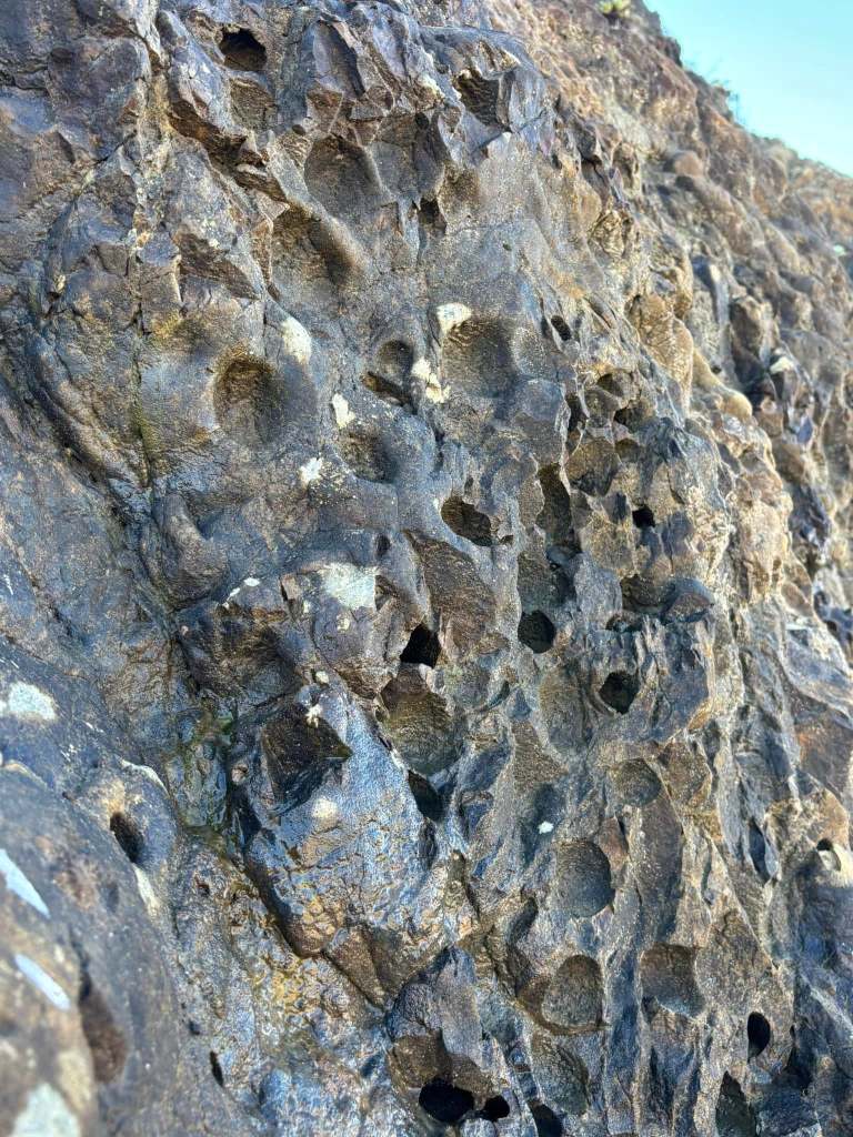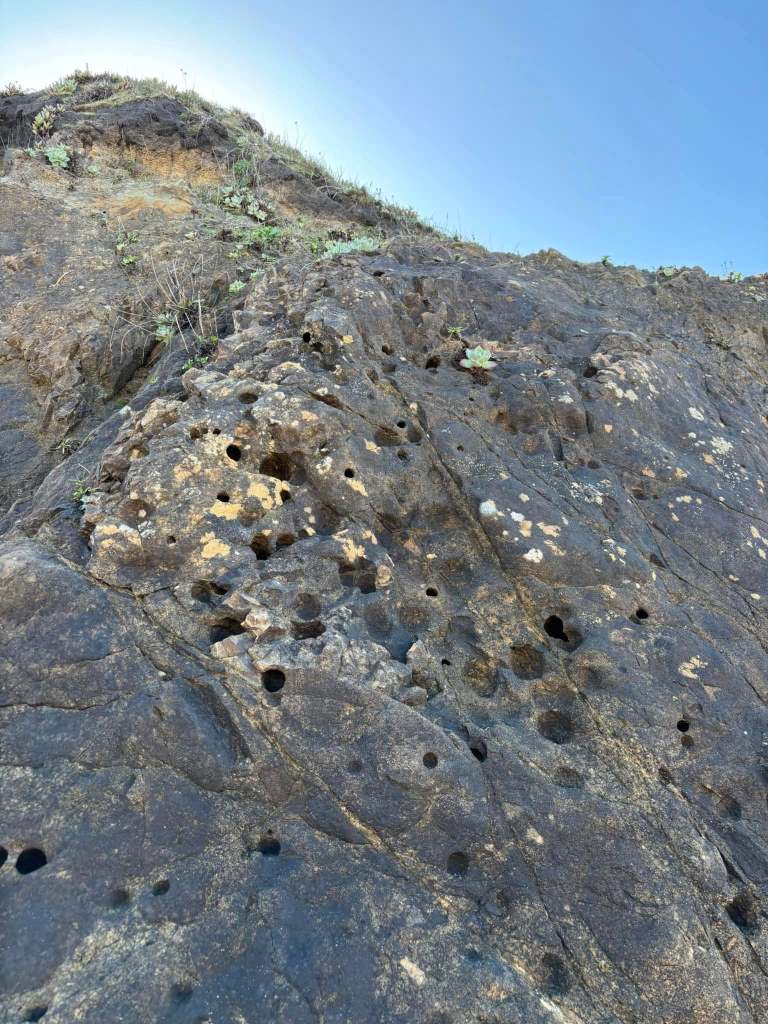 Trace fossils of Pholad boreholes (Pholadidae/bivalve mollusk/Boring clams) in the sandstone and greywacke cliff face of the MIS5-5e terrace (approx 100-120ka), on the northern Mendocino coast.. and within the geologic Coastal Belt of the Franciscan Complex